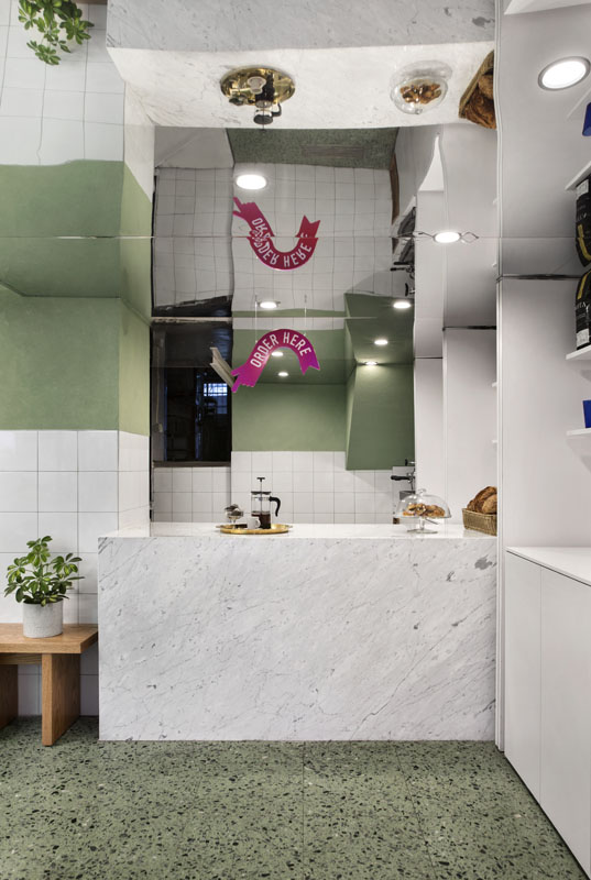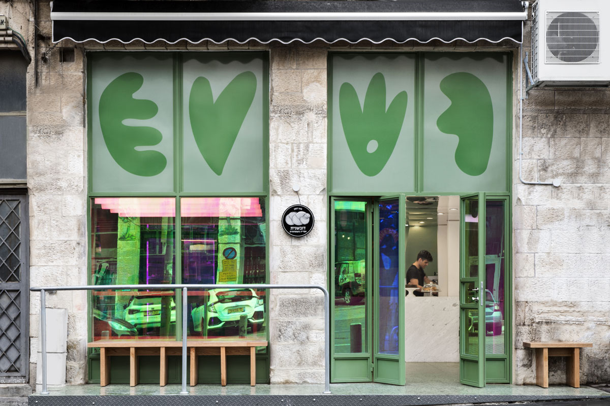 בחירת צבעונית מרגיעה וחומרים טבעיים מעמיקה את זיקת המקום ומאפייניה: ניקיון, סטריליות, חוויה חושית ובמתכונת מודרנית. חלונות זכוכית דיכרואית שהן נקודת המוקד התכנוני יוצרים השתקפויות מסתקרנות בחוץ ואפקטי צבע מסחררים בפנים. בסביבה תחרותית שכזו מתבקשת חזית מעוררת תיאבון, בולטת ונעימה. קונטרסט בין חומרים, משחקי אור ושקיפויות מחזקים את האסתטיקה הנבחרת ומקיימים מרחב נעים ונקי, ובתקציב נגיש.